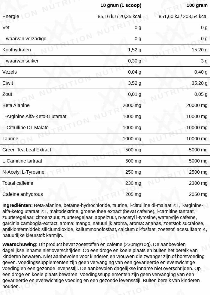 Damen achten darauf; XXL Nutrition führt ein speziell entwickeltes Pre Workout für Frauen ein. Dieses leistungsstarke Pre-Workout hilft Ihnen bei jeder Art von Training. vom schweren Krafttraining bis zum explosiven Sprinttraining. Women's Pre Workout von XXL Nutrition enthält leistungsstarke Inhaltsstoffe wie Beta Alanin, L-Citrullin und Taurin. Eine Portion (10 Gramm) liefert Ihnen auch nicht weniger als 230 mg Koffein. Das Women's Pre Workout von XXL Nutrition unterstützt Ihre schwere Trainingsphase optimal und hat auch einen wunderbar frischen Fruchtpunschgeschmack.